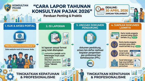 DSimplytax – Jakarta: Konsultan pajak yang telah memperoleh izin praktik sebelum tahun 2026 diwajibkan menyampaikan laporan tahunan sebagai bentuk pertanggungjawaban profesional. Batas waktu pelaporan {...}